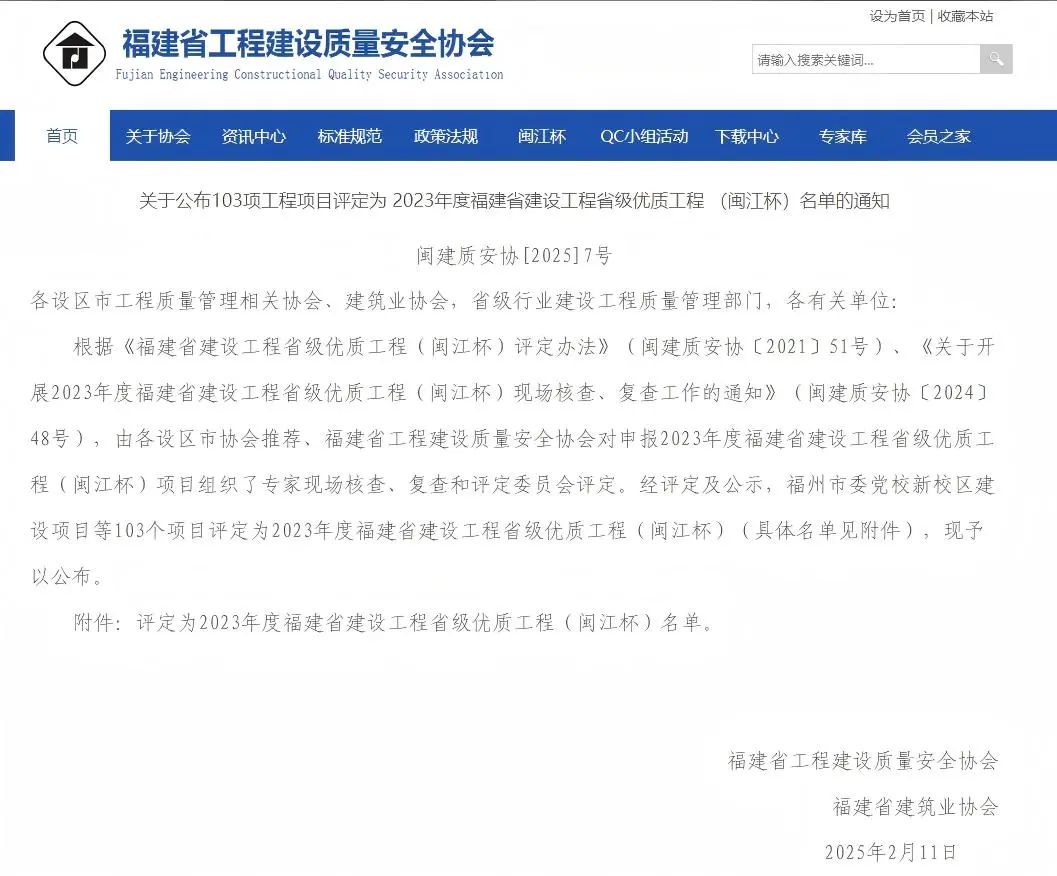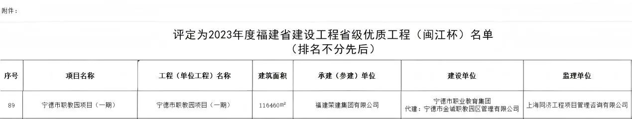 近日,2023年度福建省建设工程省级优质工程(闽江杯)获奖名单公布,宁德市职教园项目(一期)被评定为2023年度福建省建设工程省级优质工程(闽江杯)。据了解,此荣誉为福建省内建设工程质量最高荣誉奖。