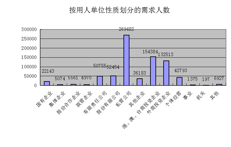 从用人单位性质来看:私营公司、港澳台商投资企业、外商投资企业为用工需求量前三位的用人单位,用工需求量分别占需求总量的34.34%、19.67%、16.88%,内资企业需求总量为44.66万人次,所占比重达到56.91%。