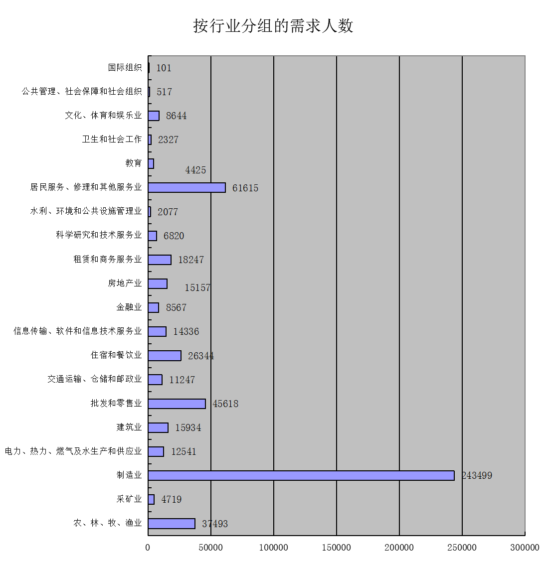 从行业需求来看:“制造业”、“居民服务、修理和其他服务业”、“批发和零售业”占据着各行业中用工量的前三位。“制造业”占比45.07%排在第一位,“居民服务、修理和其他服务业”占比11.41%位居第二位,“批发和零售业”占比8.44%排在第三位。