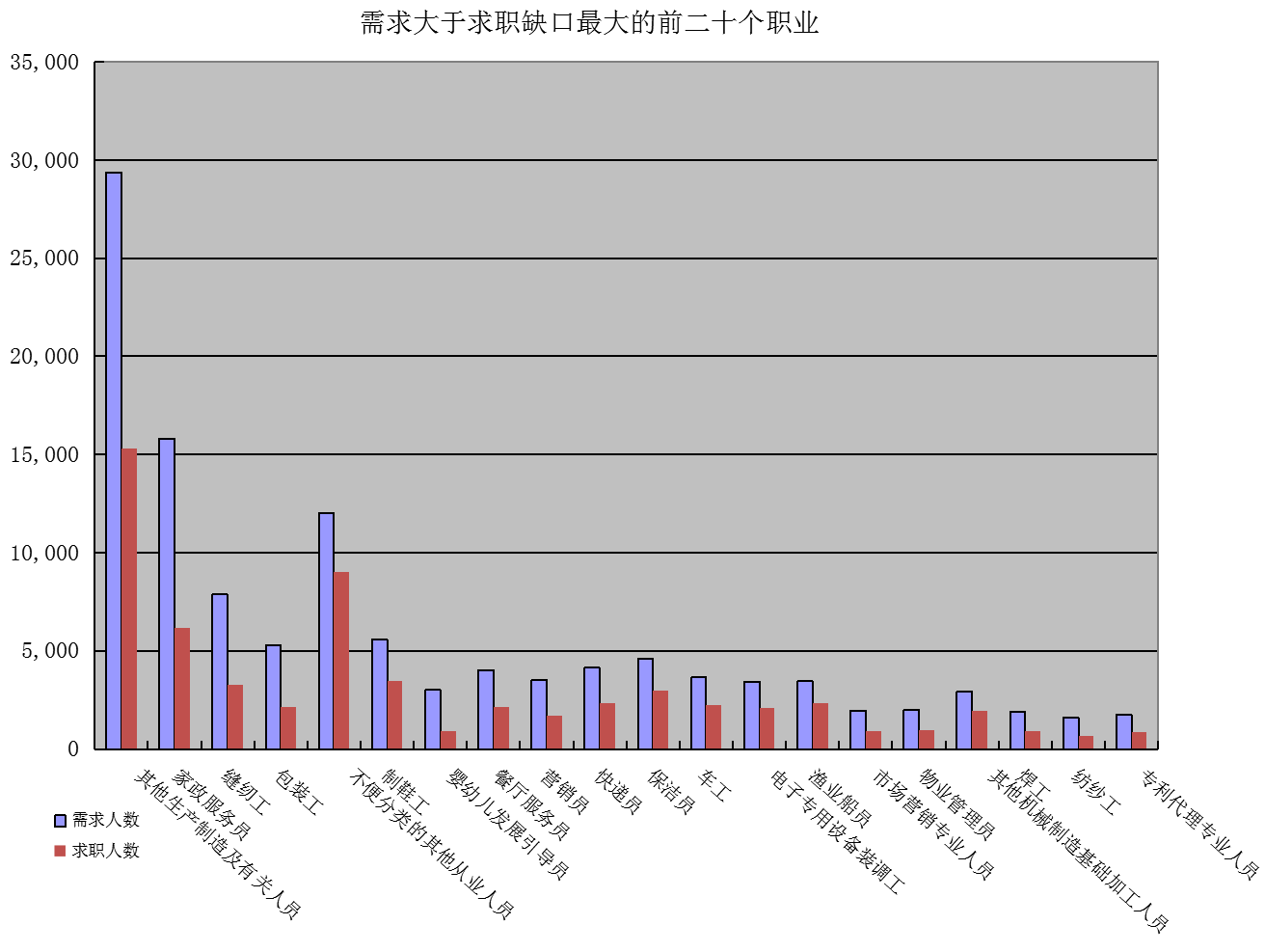 一是求大于供岗位(工种):生产制造及有关人员、家政服务员、缝纫工登记缺口分别是14050人次、9656人次、4591人次。二是供大于求岗位(工种):行政办事员、收银员、保安员的市场登记缺口分别是-2732人次、-2366人次、-2206人次。