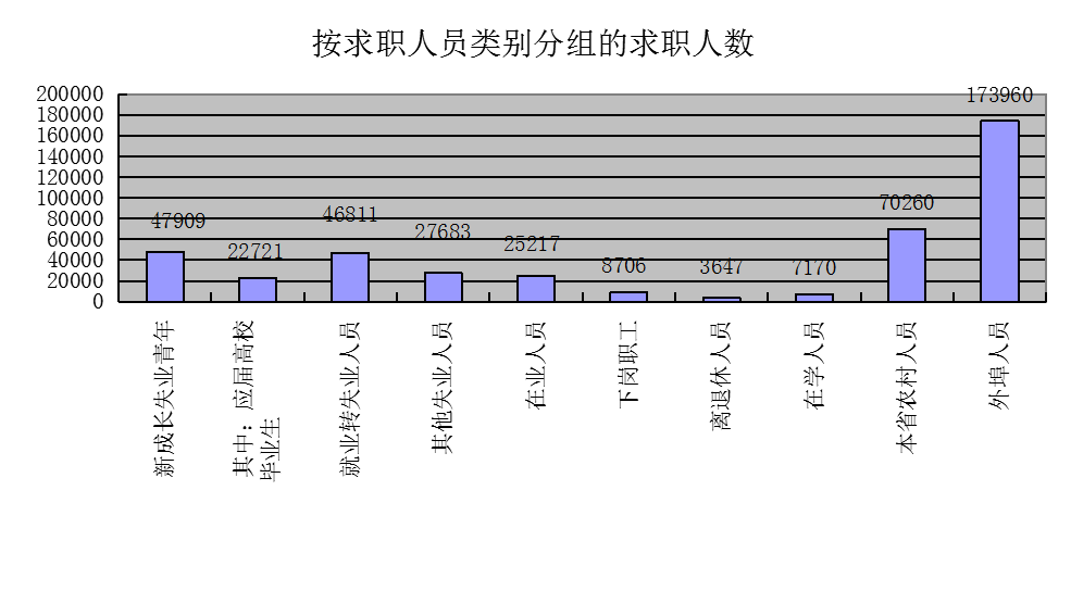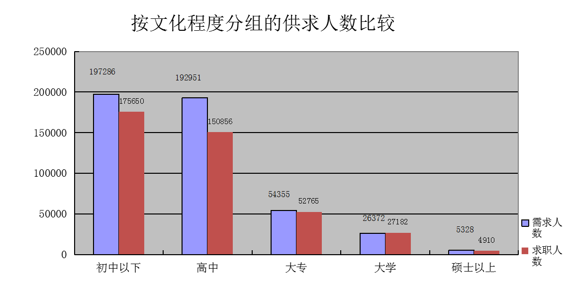 从文化程度上看,高中和初中以下学历的求职人员占求职总数的79.37%,整个人力资源供给市场学历仍相对较低,人力资源供给的素质结构需要进一步提升。