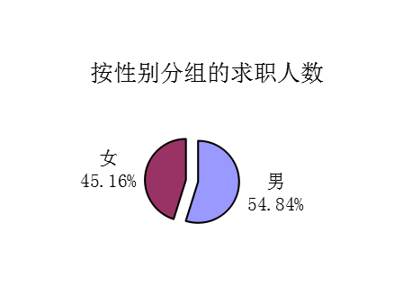 从性别上看,男、女求职人数各占总量的54.84%和45.16%,男性劳动力供给仍然高于女性,女性求职人数占求职总人数比例同比上升1.40个百分点。