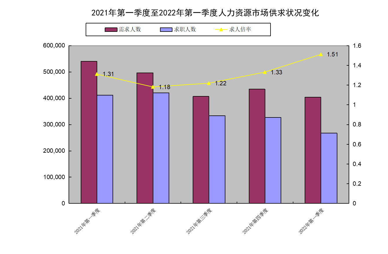 第一季度,岗位需求人数、求职人数环比下滑,但人力资源市场供求关系趋于紧张。大多数企业仍存在一定用工缺口,但受疫情影响,用工需求明显少于上年同一季度。
