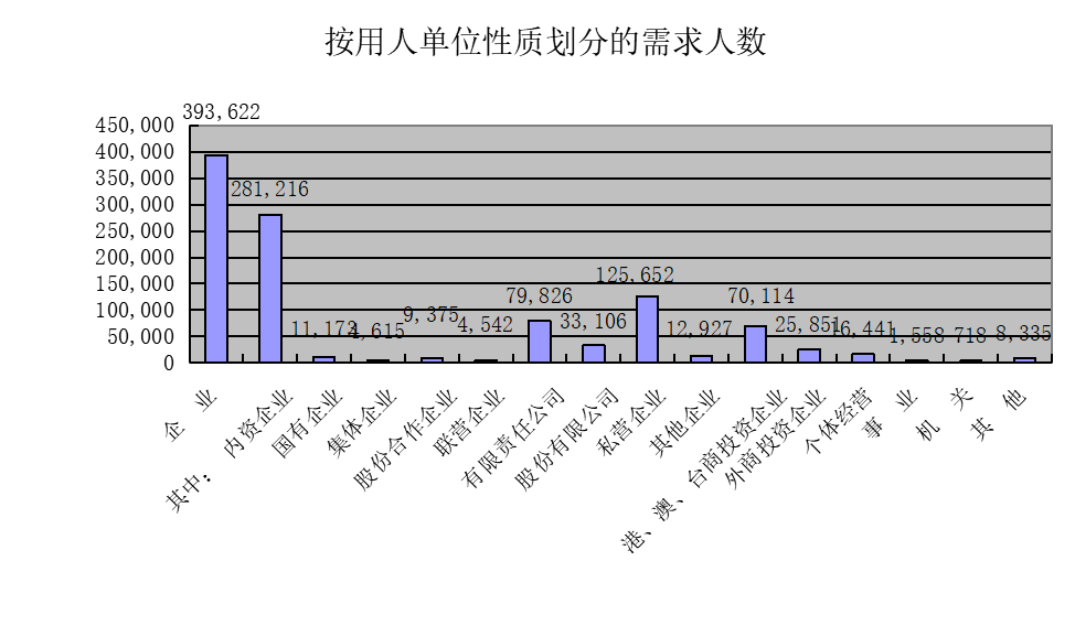从用人单位性质来看:“私营公司”、“有限责任公司”、“股份有限公司”为用工需求量前三位的用人单位,用工需求量分别占需求总量的31.92%、20.28%、8.41%,内资企业需求总量为28.12万人次,所占比重达到71.44%。