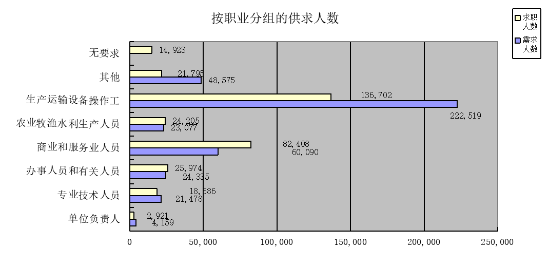 本季度职业供求总量为67.16万人次,同比下降29.42%,环比下降11.86%。其中:岗位需求登记40.42万人次,同比下降25.17%,环比下降6.95%;求职登记26.74万人次,同比下降35.01%,环比下降18.37%。