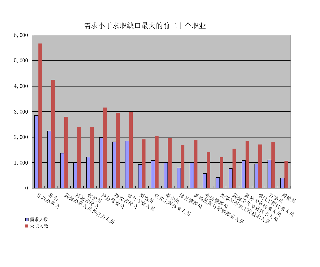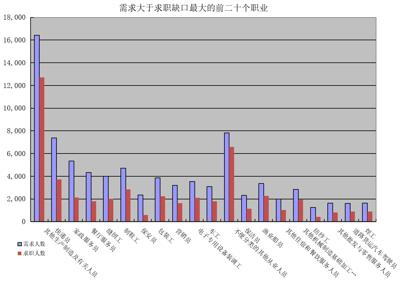 一是求大于供岗位(工种):其他生产制造及有关人员、快递员、家政服务员缺口分别是3714人次、3658人次、3192人次。二是供大于求岗位(工种):行政办事员、秘书、其他办事人员和有关人员的市场登记缺口分别是-2823人次、-2007人次、-1431人次。