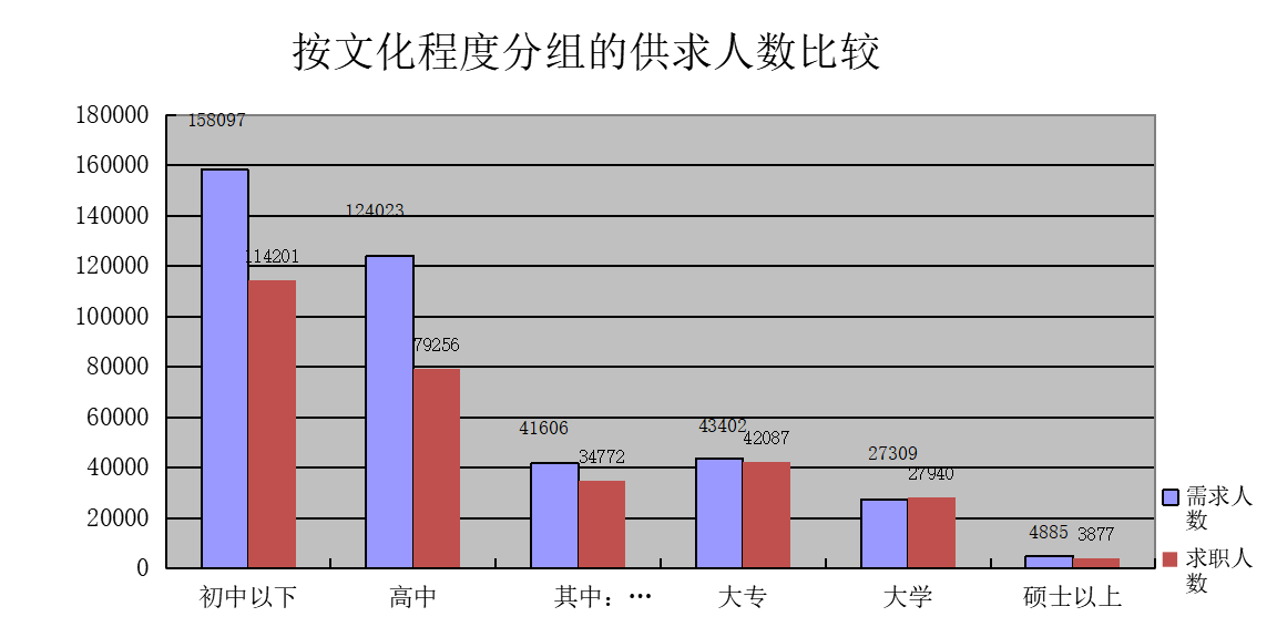 从文化程度上看,高中和初中以下学历的求职人员占求职总数的72.35%,整个人力资源供给市场学历仍相对较低,人力资源供给的素质结构需要进一步提升。