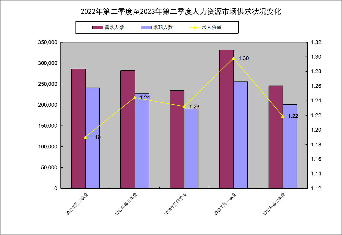 第二季度,岗位需求人数、求职人数环比均下滑,人力资源市场供求关系趋于缓和。大多数企业仍存在一定用工缺口,用工需求和求职人数均明显少于上年同一季度。