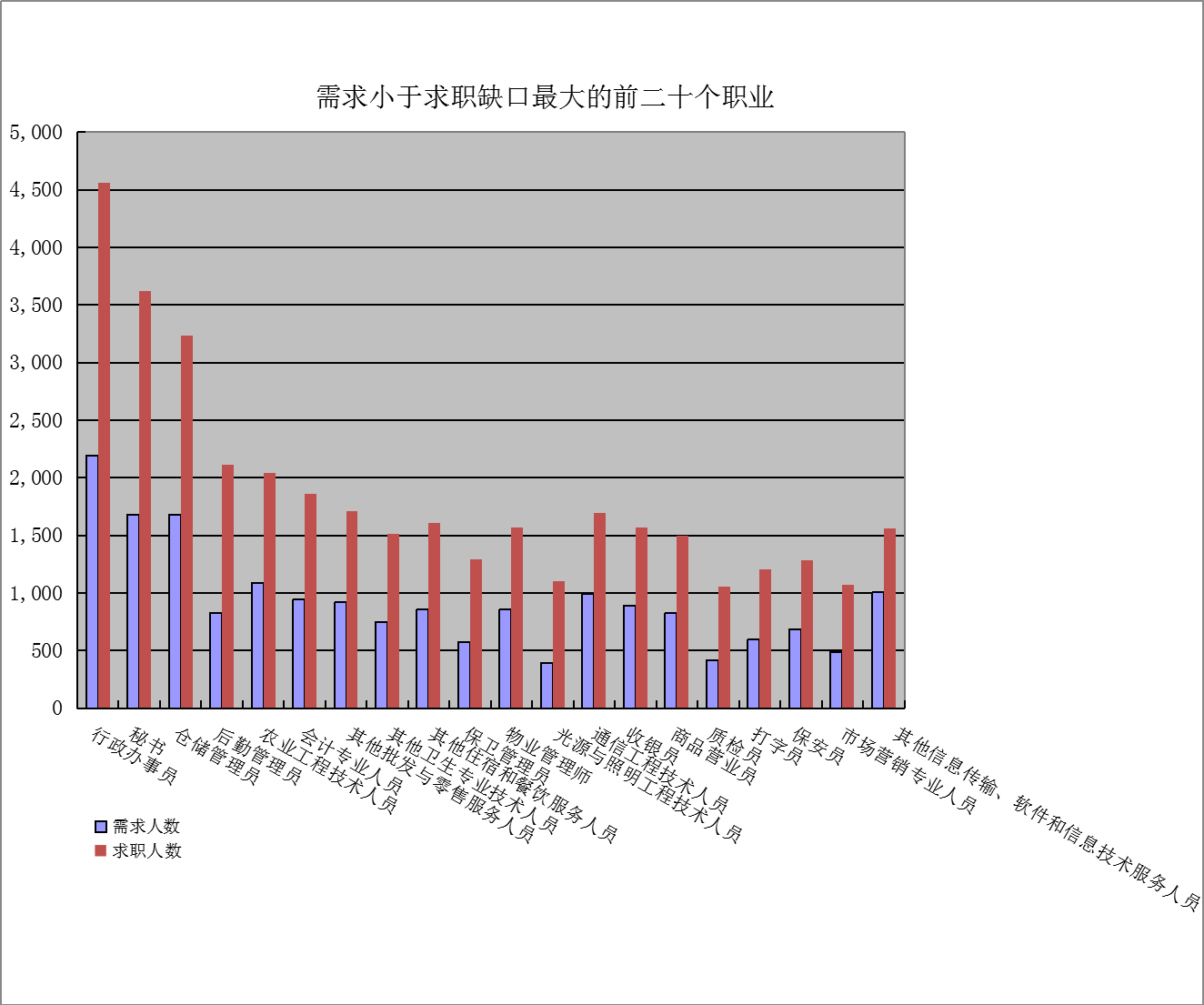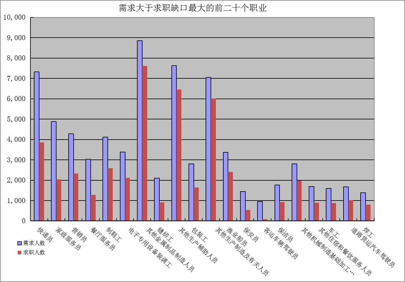 一是求大于供岗位(工种):“快递员”、“家政服务员”、“营销员”企业需求缺口分别是3467人次、2829人次、1945人次。二是供大于求岗位(工种):“行政办事员”、“秘书”、“仓储管理员”的市场登记缺口分别是-2373人次、-1942人次、-1553人次。