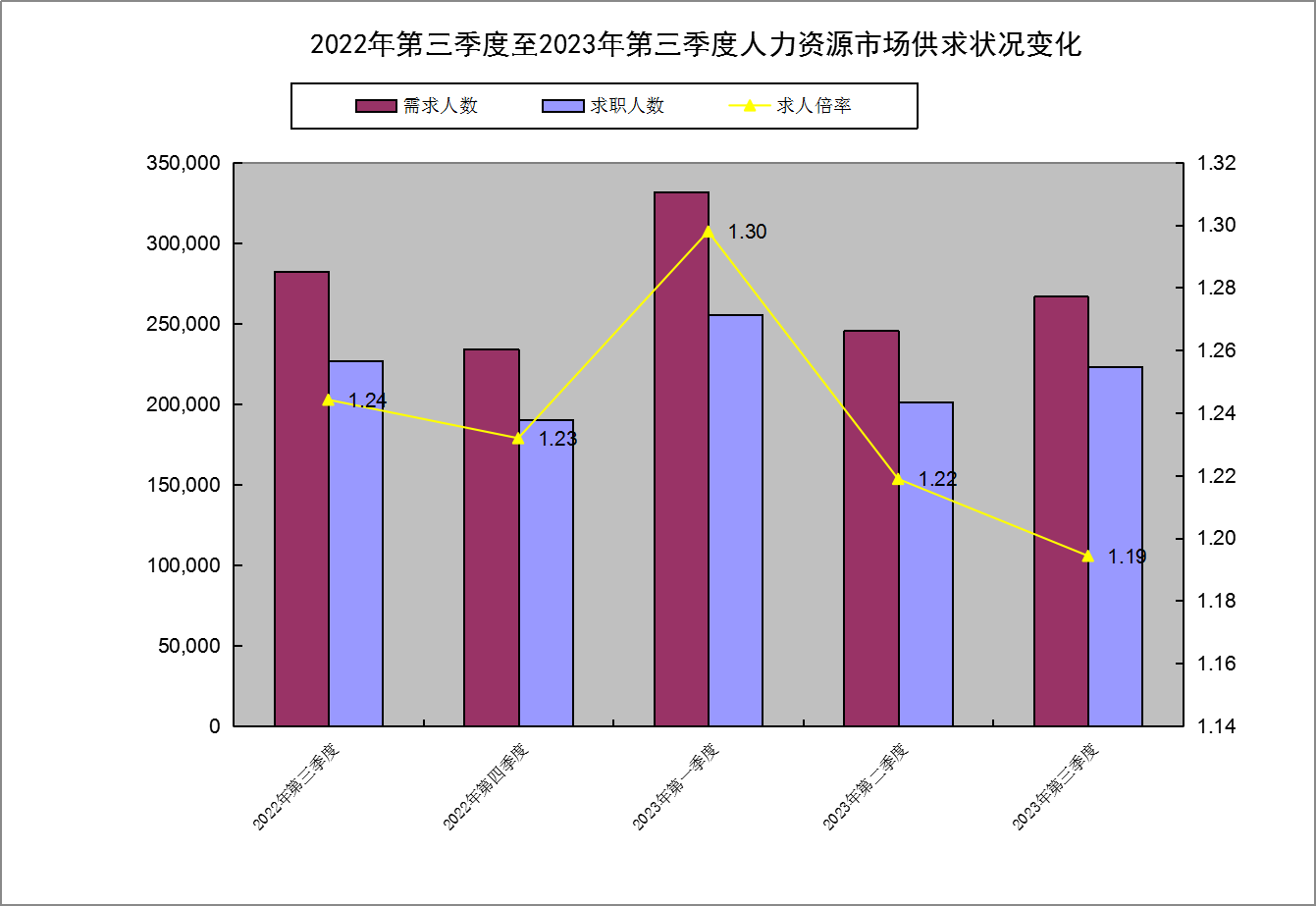 第三季度,岗位需求人数、求职人数环比均上升,求人倍率下降,人力资源市场供求关系趋于缓和。大多数企业仍存在一定用工缺口,用工需求和求职人数较上年同一季度略有下降。