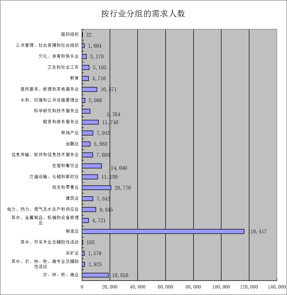从行业需求来看:“制造业”“批发和零售业”“农、林、牧、渔业”占据着各行业中用工量的前三位。占比依次为43.64%、7.79%、7.07%。