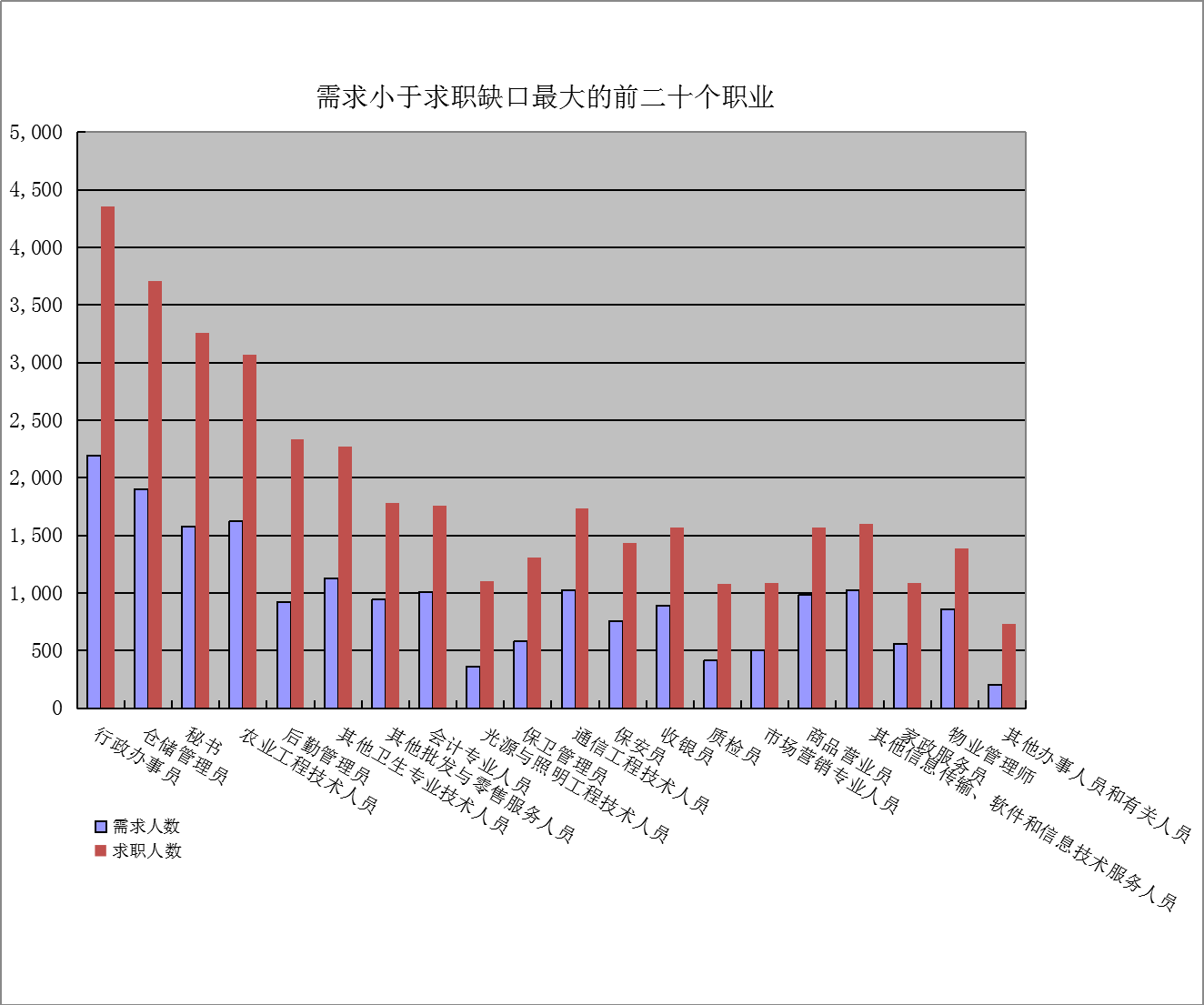 一是求大于供岗位(工种):“快递员”、“家政服务员”、“营销员”企业需求缺口分别是4409人次、3867人次、1927人次。二是供大于求岗位(工种):“行政办事员”、“仓储管理员”、“秘书”的市场登记缺口分别是-2164人次、-1803人次、-1673人次。