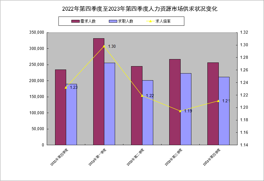 第四季度,岗位需求人数、求职人数环比均下降,求人倍率上升,人力资源市场供求关系趋于稳定。大多数企业仍存在一定用工缺口,用工需求和求职人数较上年同一季度略有上升。