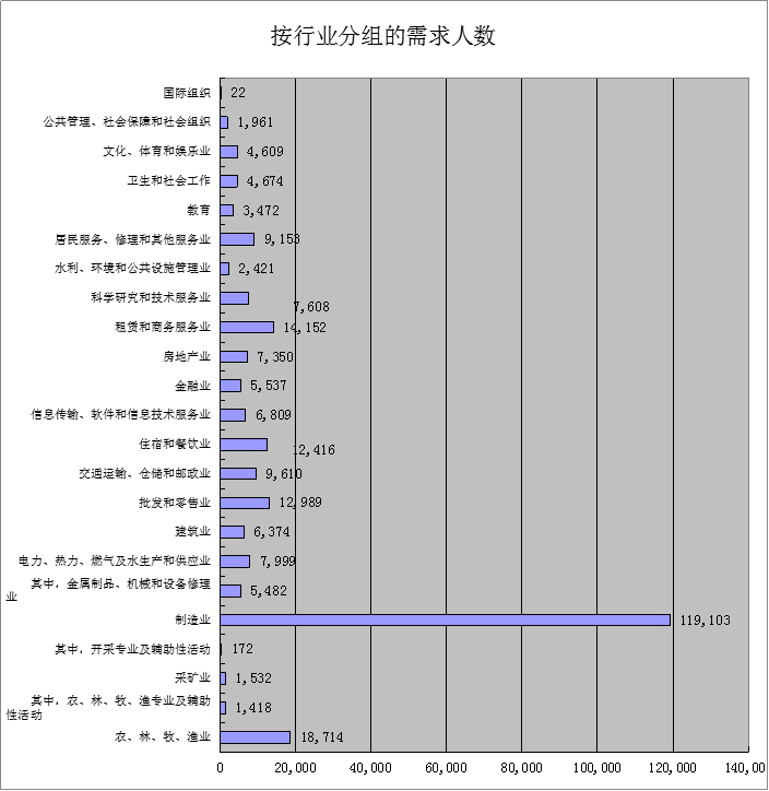 从行业需求来看:“制造业”“农、林、牧、渔业”“租赁和商务服务业”占据着各行业中用工量的前三位。占比依次为46.43%、7.30%、5.52%。