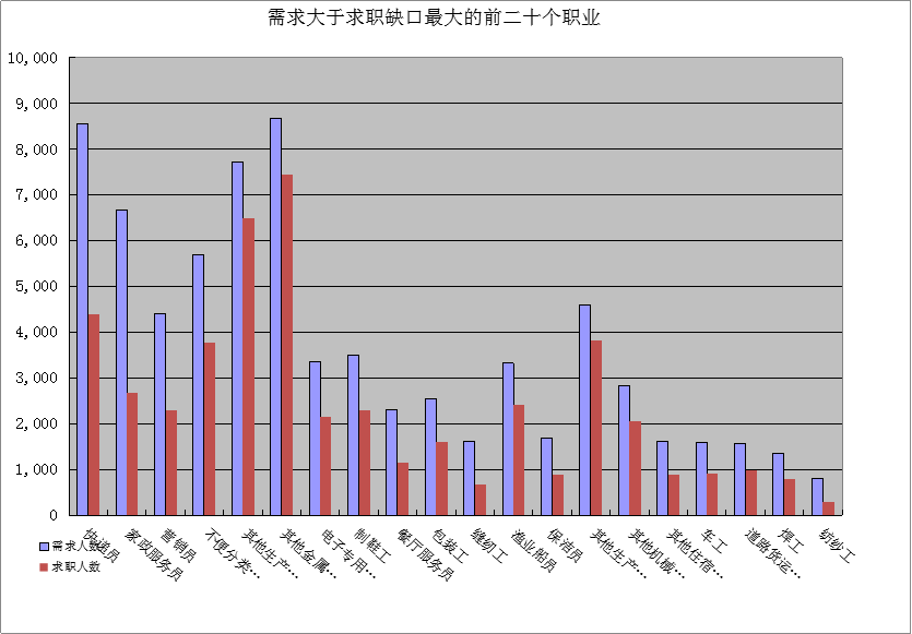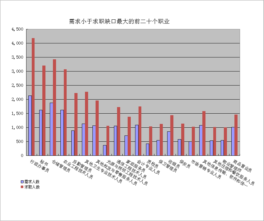 一是求大于供岗位(工种):“快递员”、“家政服务员”、“营销员”企业需求缺口分别是4166人次、3986人次、2102人次。二是供大于求岗位(工种):“行政办事员”、“秘书”、“仓储管理员”的市场登记缺口分别是-2049人次、-1575人次、-1547人次。
