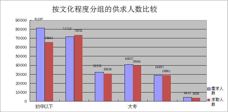 从文化程度上看,高中和初中以下学历的求职人员占求职总数的65.83%,整个人力资源供给市场学历仍相对较低,人力资源供给的素质结构需要进一步提升。