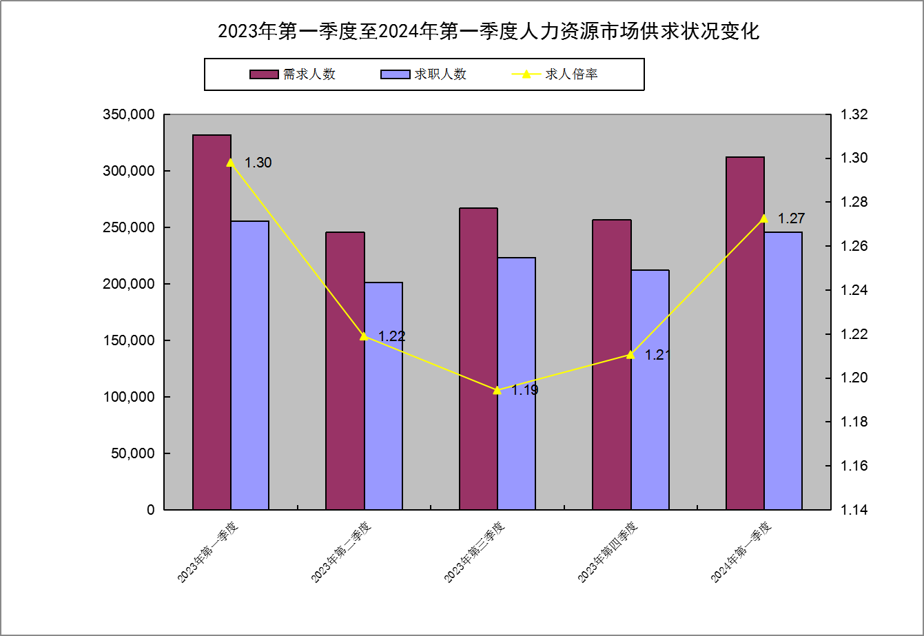 本季度职业供求总量为55.77万人次,同比下降5.05%,环比上升19.06%。其中:岗位需求登记31.23万人次,同比下降5.87%,环比上升21.75%;求职登记24.54万人次,同比下降3.99%,环比上升15.82%。