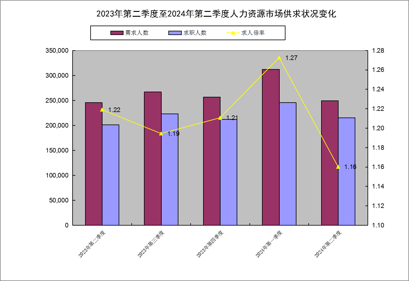 第二季度,随着两节用工高峰期的结束,全省企业用工需求和求职人数较上季度环比有较大幅度下降,但较上年同期,岗位需求人数、求职人数同比均有所上升。求人倍率同比、环比均有所下降,供求人数差距相比去年同期缩小,人力资源市场供求关系趋于平衡。