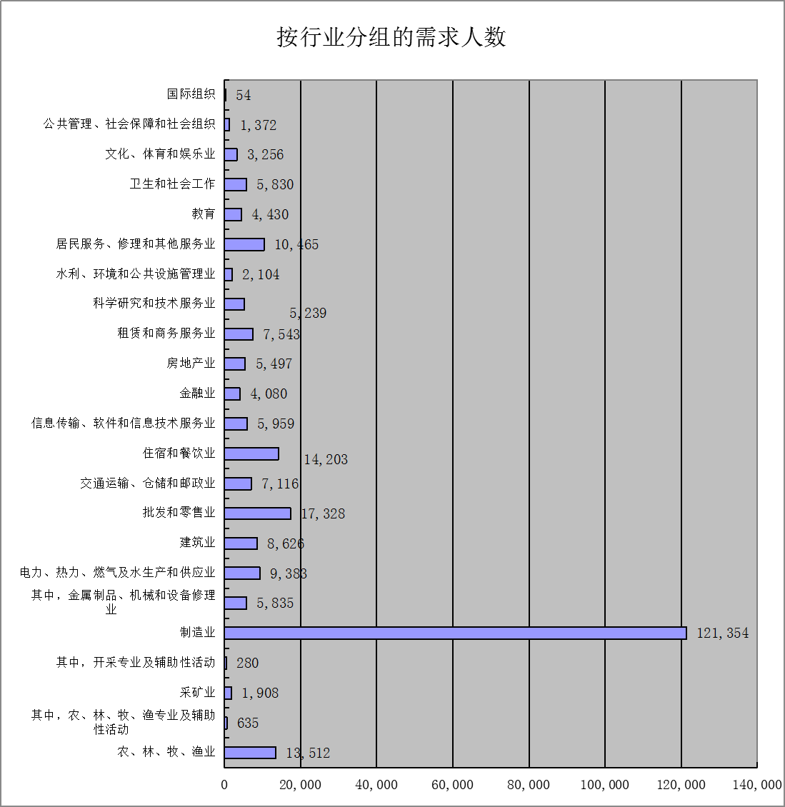 从行业需求来看:“制造业”“住宿和餐饮业”“农、林、牧、渔业”占据着各行业中用工量的前三位。占比依次为48.69%、5.70%、5.42%。