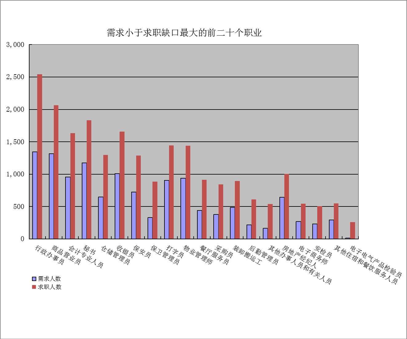 一是求大于供岗位(工种):“其他生产制造及有关人员”、“快递员”、“营销员”企业需求缺口分别是3742人次、1435人次、1286人次。二是供大于求岗位(工种):“行政办事员”、“商品营业员”、“会计专业人员”的市场登记缺口分别是-1197人次、-751人次、-676人次。